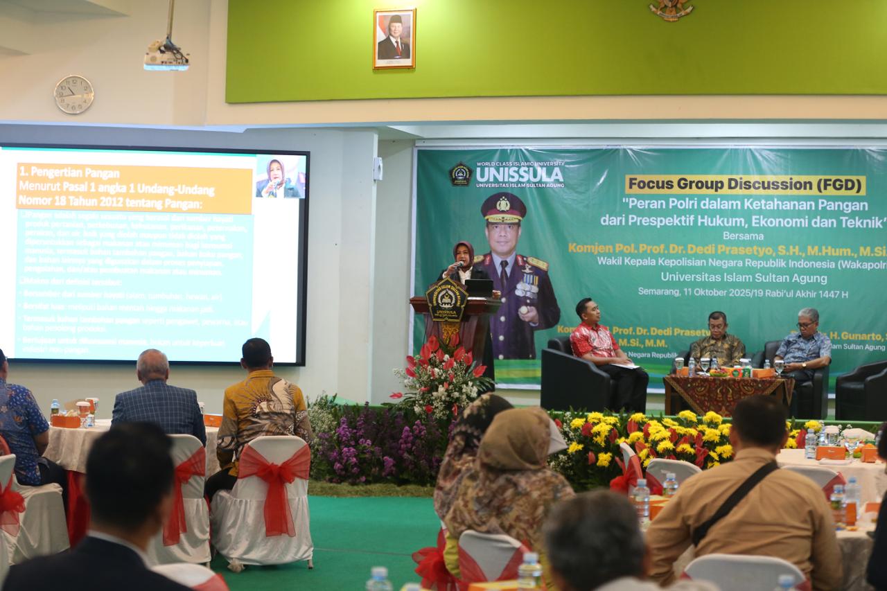 Unissula menggelar Focus Group Discussion (FGD) bertajuk peran Polri dalam ketahanan pangan dari perspektif hukum, Ekonomi, dan teknik di Gedung Kuliah Bersama lantai 10, Sabtu (11/10/2025). Kegiatan ini menghadirkan tiga narasumber lintas disiplin ilmu, yakni Prof Dr Anis Masdurohatun SH MHum (Ketua Program S3 Ilmu Hukum), Prof Dr Widodo SE MSi (Ketua Program S3 Ilmu Manajemen), dan Prof Dr Ir Slamet Imam Wahyudi DEA (Ketua Program S3 Teknik Sipil). Adapun moderator Dr Mochamad Abdul Basyir SPd MPd.