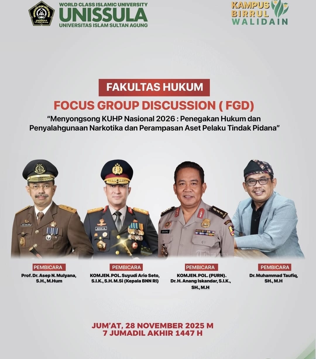 Fakultas Hukum Unissula akan menyelenggarakan FGD tentang menyongsong KUHP Nasional 2026. Penegakan Hukum dan Penyalahgunaan Narkotika dan Perampasan Aset Pelaku Tindak Pidana 2023. Diskusi akan digelar Jumat, 28 November 2025 di Ruang Seminar lt. 3 FH Unissula.