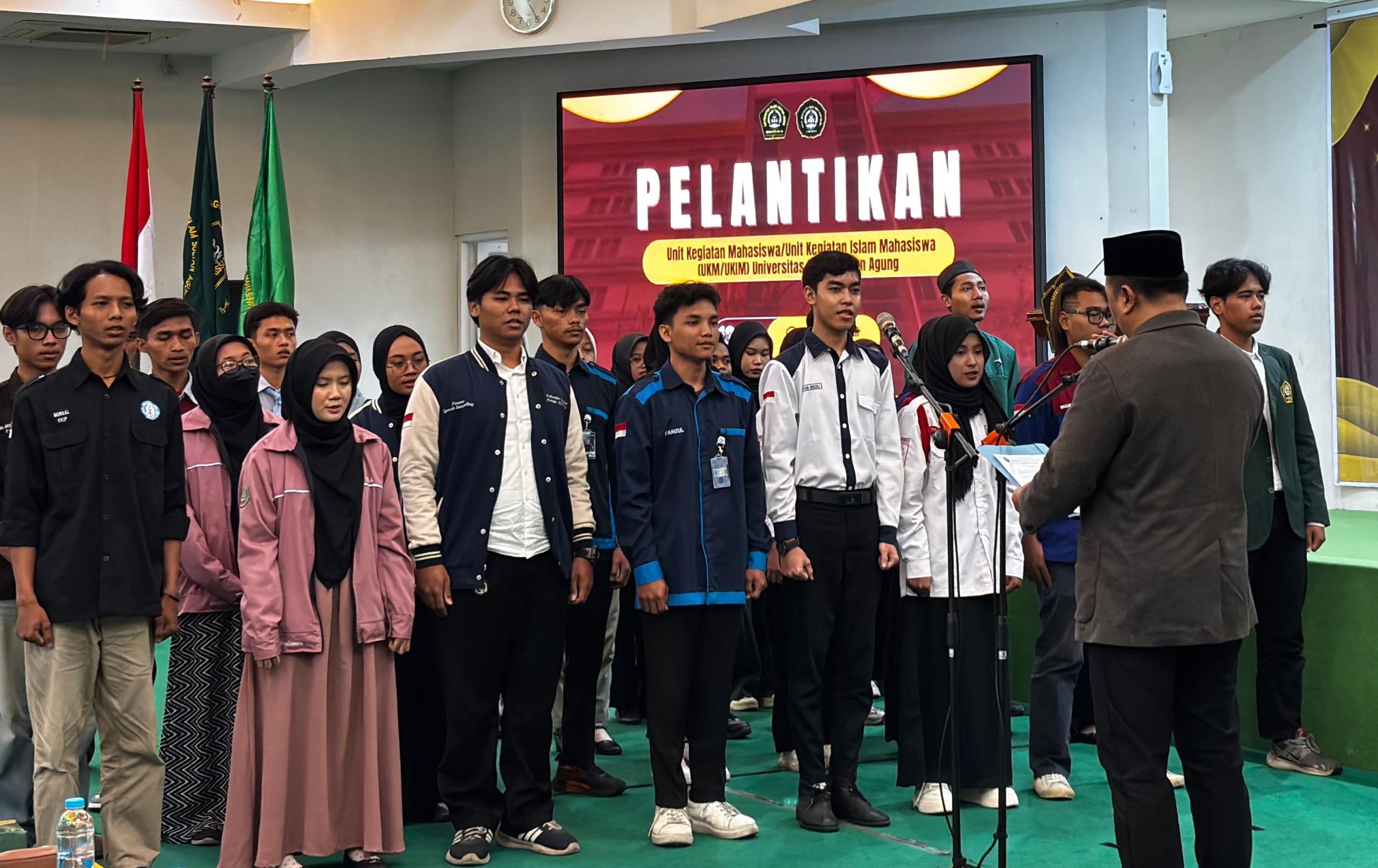 Pengurus 15 Unit Kegiatan Mahasiswa (UKM) dan Unit Kegiatan Islam Mahasiswa (UKIM) Unissula mengikuti prosesi pelantikan. Pembacaan ikrar dipimpin Wakil Rektor III Dr Achmad Arifulloh SH MH di Aula GKB Lt. 10 Jalan Kaligawe, Jumat (13/2/2026).