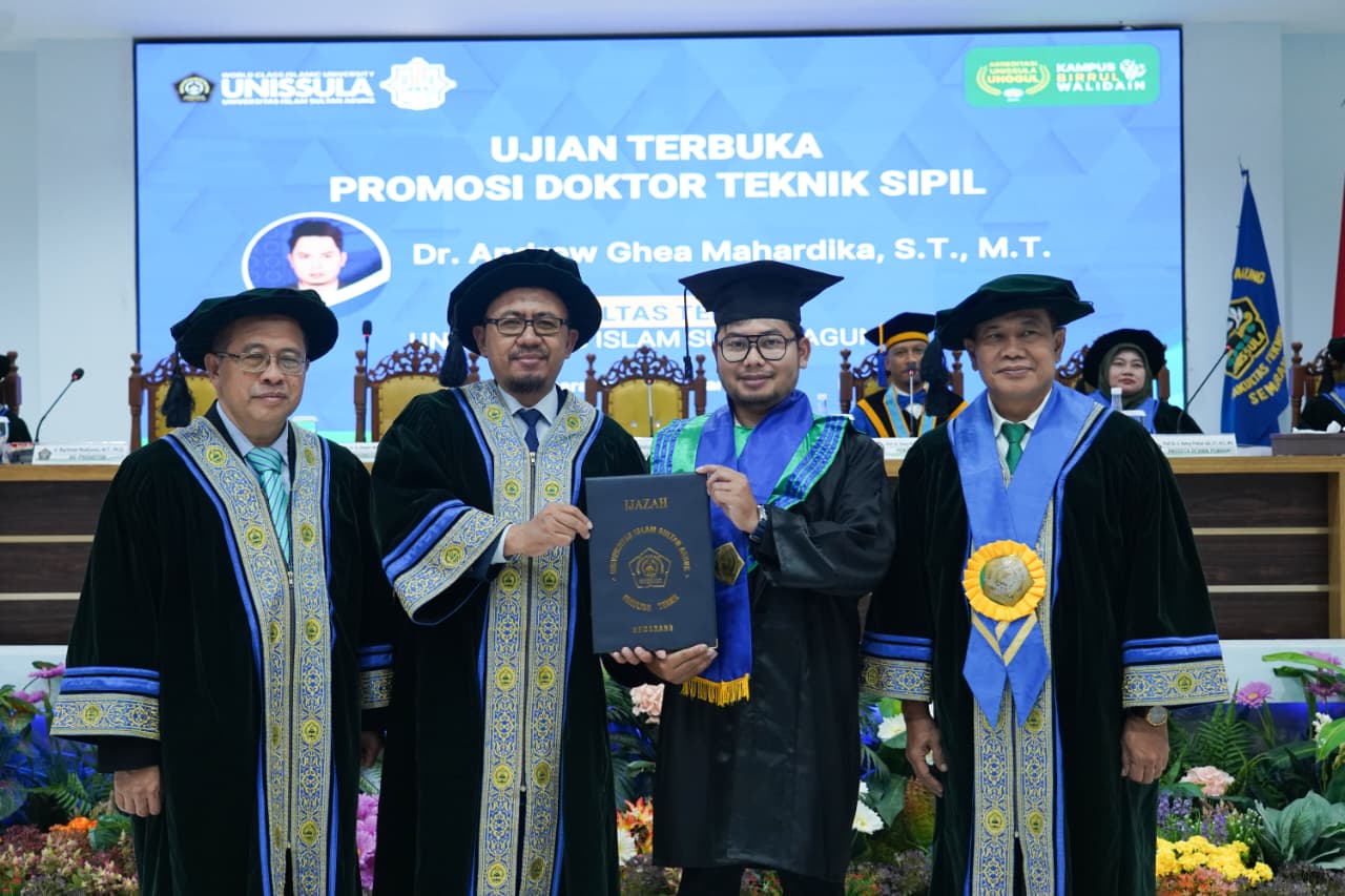Mahasiswa Program Doktor Teknik Sipil Fakultas Teknik Unissula, Andrew Ghea Mahardika ST MT mengikuti ujian terbuka doktor pada Kamis (12/2/2026) di Aula Fakultas Teknik. Ia mempresentasikan disertasinya yang berjudul analisis transmisi pada model pemecah gelombang tenggelam dari Artificial Reef Brick-2 (ARB-2).
