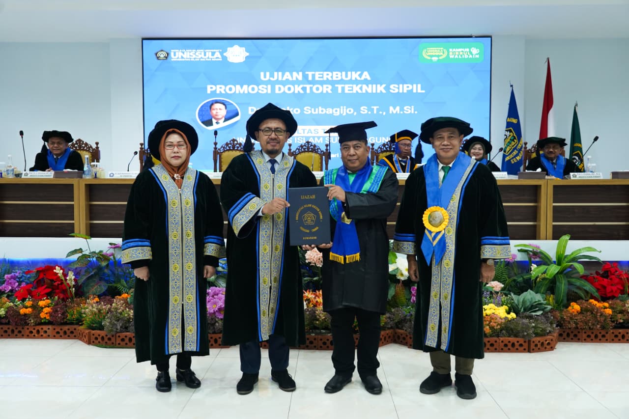Mahasiswa Program Doktor Teknik Sipil (PDTS) Fakultas Teknik Unissula, Djoko Subagijo ST MSi mengikuti ujian terbuka doktor pada Kamis (12/2/2026) di Aula Fakultas Teknik. Ia mempresentasikan disertasinya yang berjudul Model Estimasi Biaya tahap konseptual konstruksi fisik pada pembangunan gedung negara.